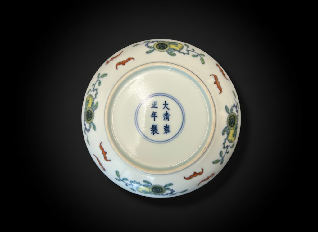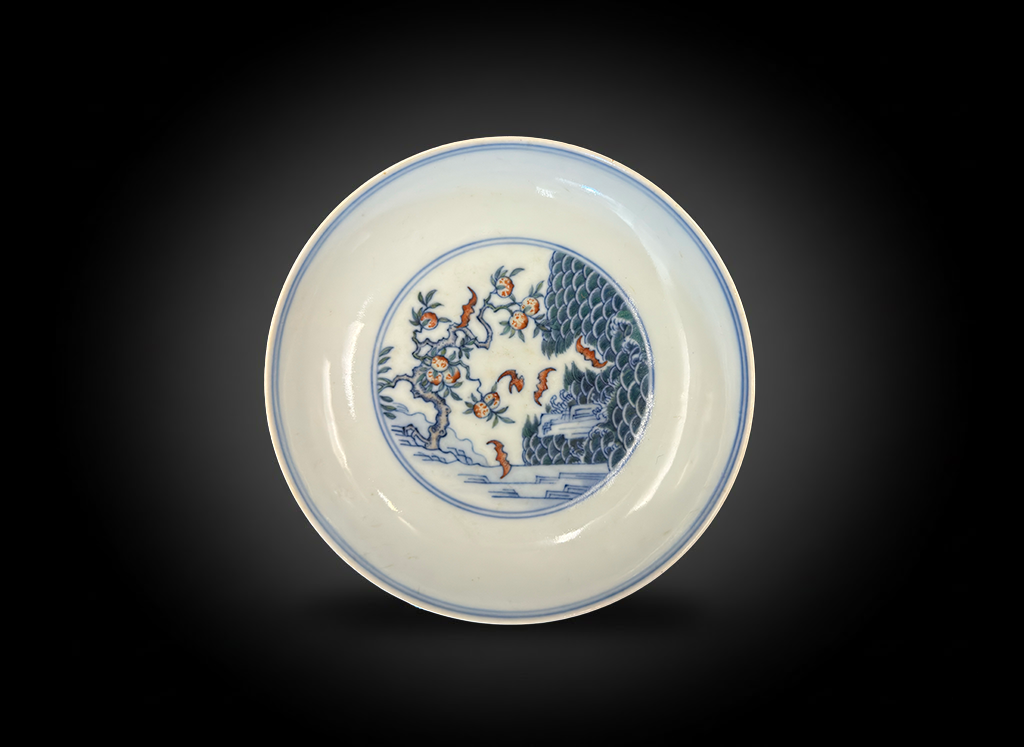 雍正时期的斗彩瓷器以秀雅著称,此盘青花发色纯净,斗彩施彩明丽,既承康熙之华,又启乾隆之精。其“桃蝠”图案寓意福寿延年,常用于宫廷祝寿陈设。此件作品构图匀称、工艺细腻,展现出雍正窑“清丽典雅、精巧内敛”的艺术精神,是清代瓷艺高峰的生动体现。