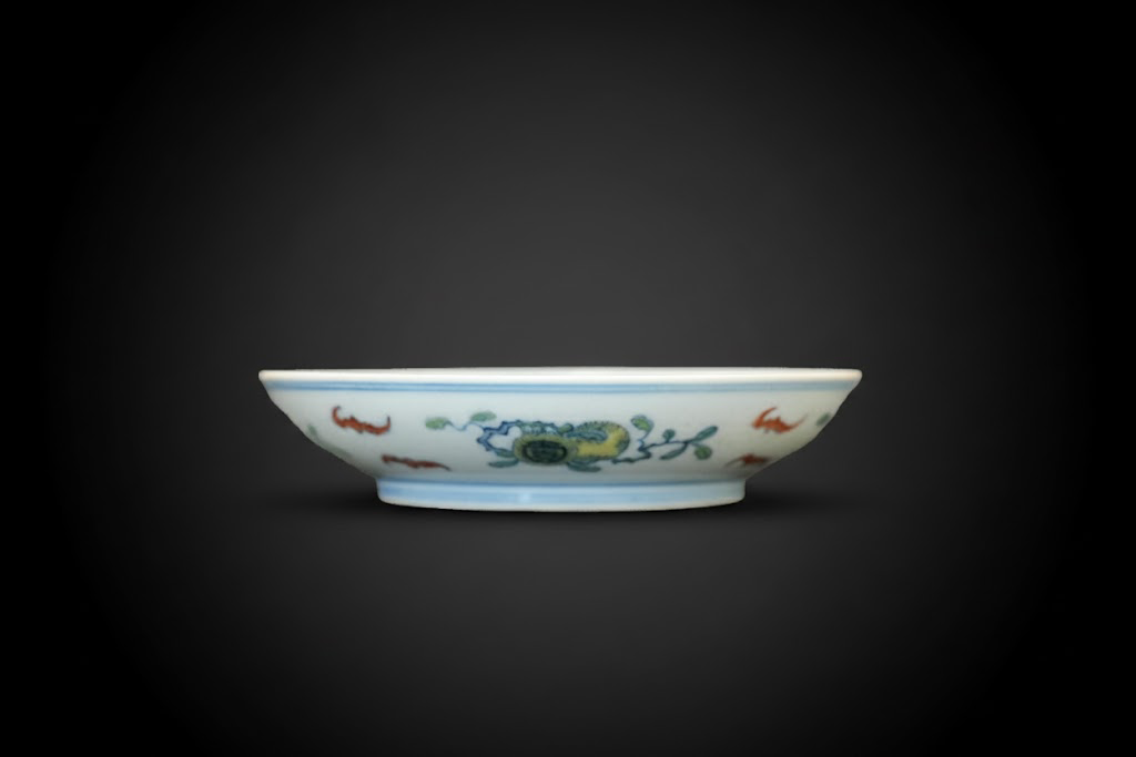这件清雍正年制青花斗彩盘,器型敞口、浅腹、圈足,线条流畅圆润,比例匀称。通体以青花绘轮廓,再施红、黄、绿等釉上彩填绘,兼具青花之雅与斗彩之华。盘径15.5cm,高3.5cm,底径9cm,彰显雍正朝瓷器追求的精致与秀雅。