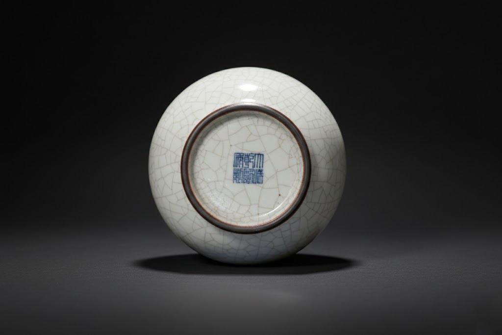 底部圈足施以深褐色护胎釉,即宋瓷“紫口铁足”之传统。圈足内留有“大清乾隆年制”六字三行篆书款,青花书写,笔法工整挺拔,底径7.8cm,为典型的乾隆官窑标准款式。