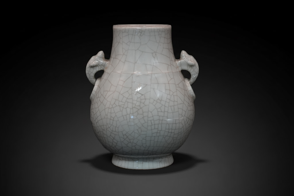 器形直颈、丰肩、鼓腹、圈足外撇,线条流畅典雅。通体灰青釉色温润如玉,细密开片随光影浮动,静中显韵。两侧龙耳立体生动,使整器更具宫廷气势。
