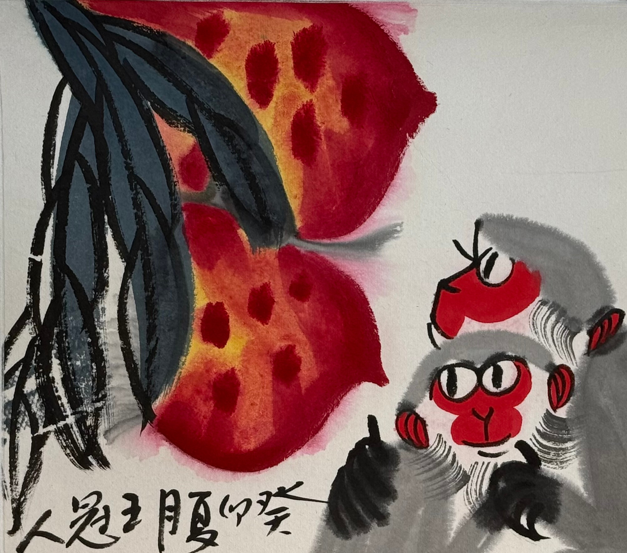 这幅名为《春风染桃红》的作品,尺寸为 34 × 34.5cm,画面描绘了两只猿猴与硕大的寿桃,寓意祥瑞与长寿。作品以灵动的笔墨与浓郁的设色展现出春意盎然的氛围,画风清新自然,构思饱满生动。