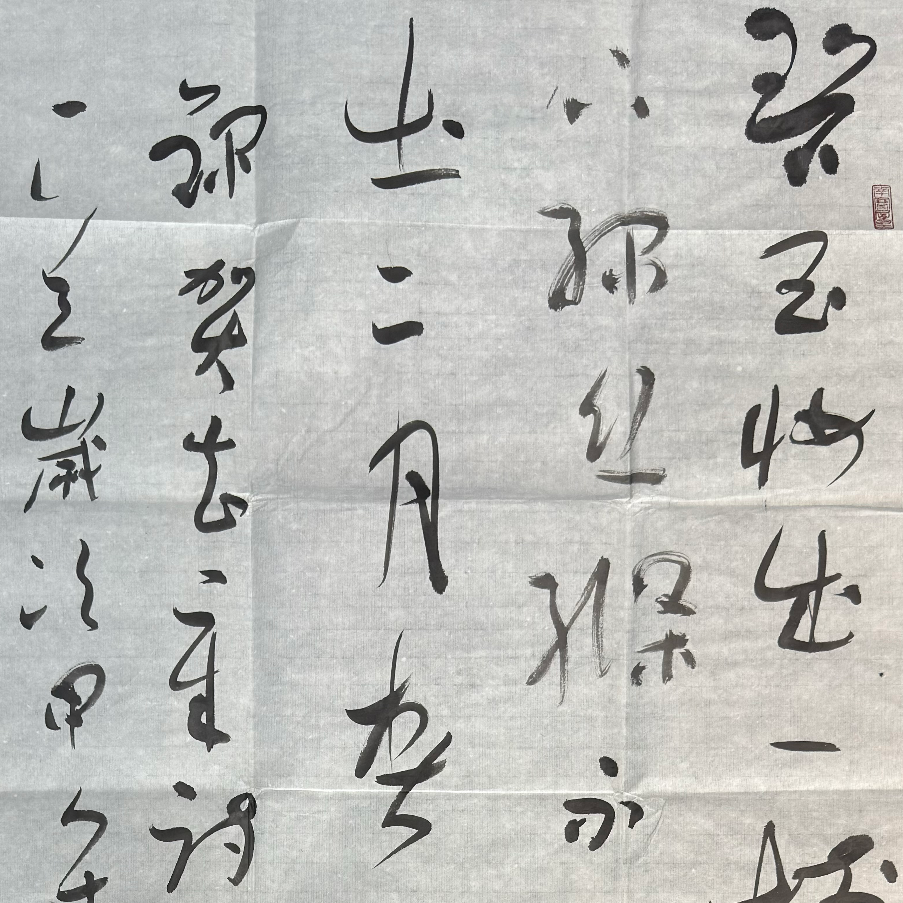 下部分的笔触更为细腻,枯润相间,飞白隐现。收笔稳重而不失灵动,气势由放转收,展现出内敛含蓄之美。左下角的印章使全作收束有力,韵致悠远。