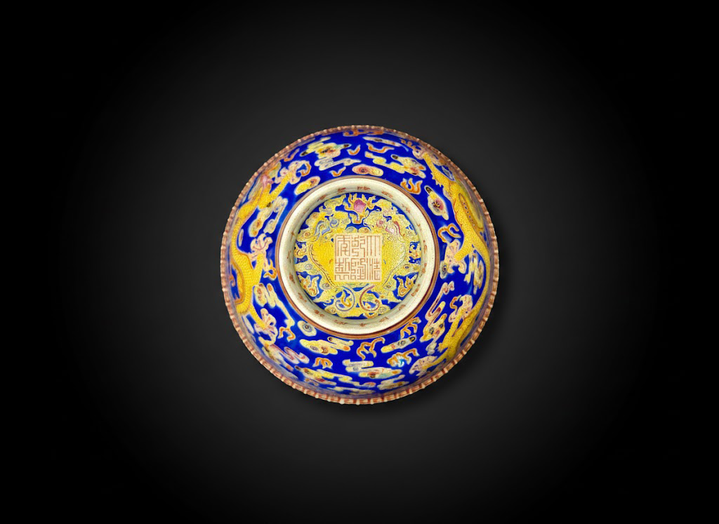 碗外以深沉的霁蓝釉为底,黄彩龙纹盘旋腾跃,穿梭祥云之间,寓意祥瑞尊贵。口沿与圈足描绘金彩几何纹与如意头纹,华丽而不失稳重。