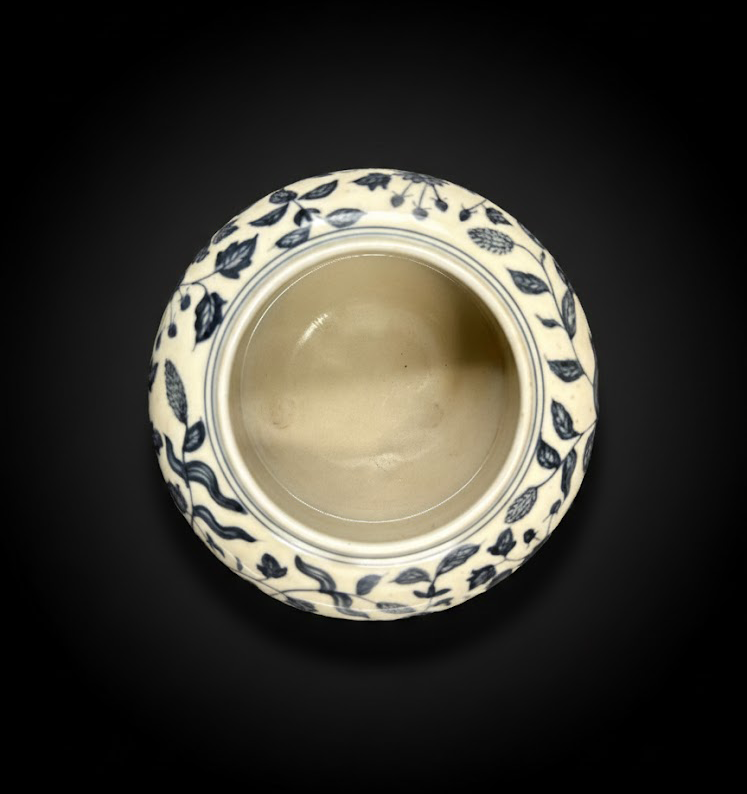 罐口规整,内外壁施釉均匀。口沿外侧饰青花缠枝花叶纹,呼应罐身主体花卉纹饰,口部微侈,显示其为典型盖罐形制。细节之处体现出成化时期对装饰完整性的讲究。