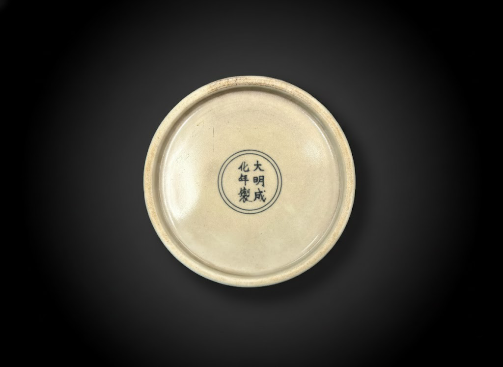 罐底平整,施淡黄色釉,釉质细腻。中心落青花双圈六字楷书款:“大明成化年製”。字体秀丽工整,与成化青花瓷器造型和纹饰风格一致。