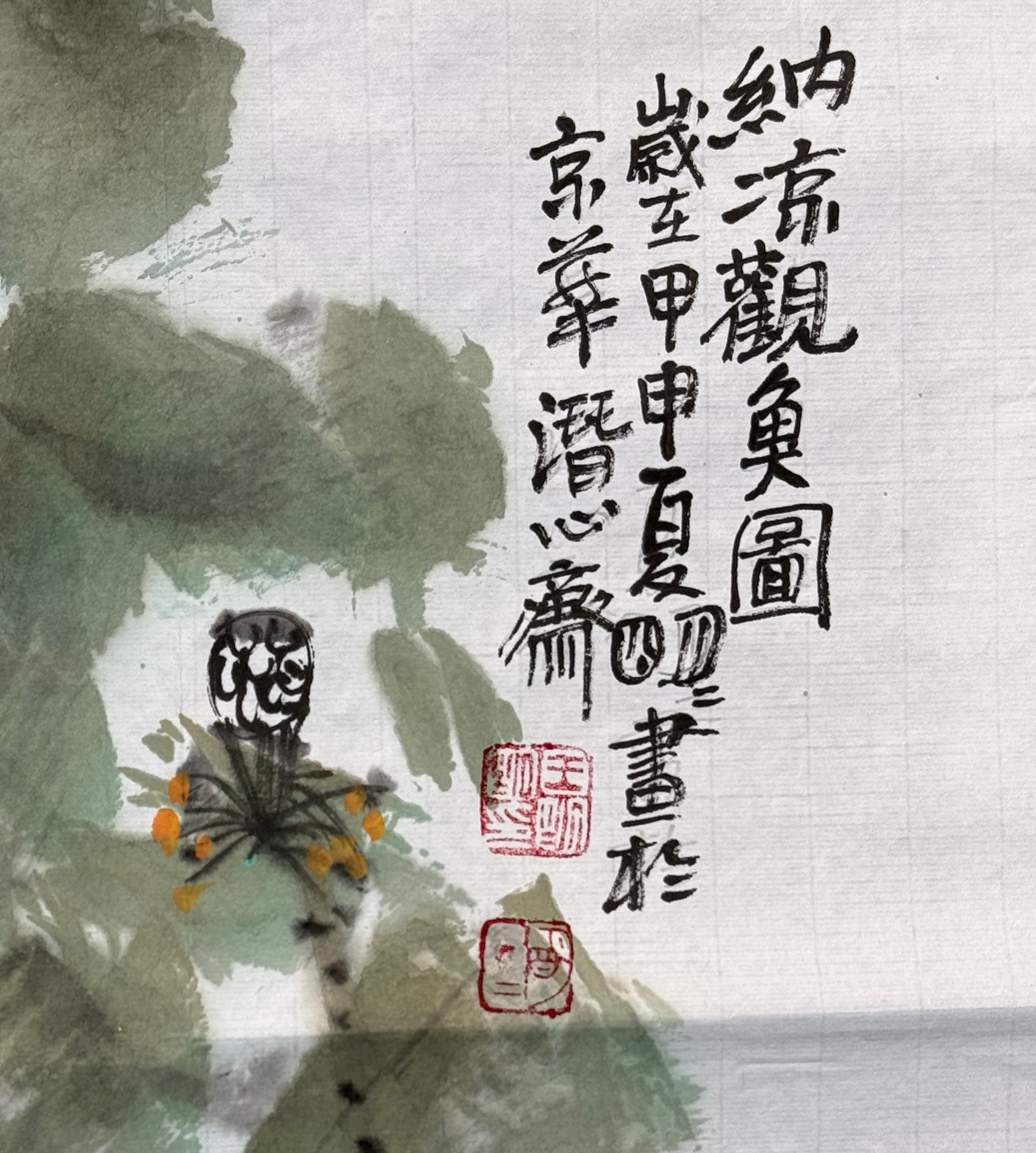 画作的题款、纪年与印章:「納涼觀魚圖。歲在甲申夏四月寫於京華」,表明作于2004年夏四月,地点为京华(北京)。两方红色印章及白文印章进一步确认了作者身份。