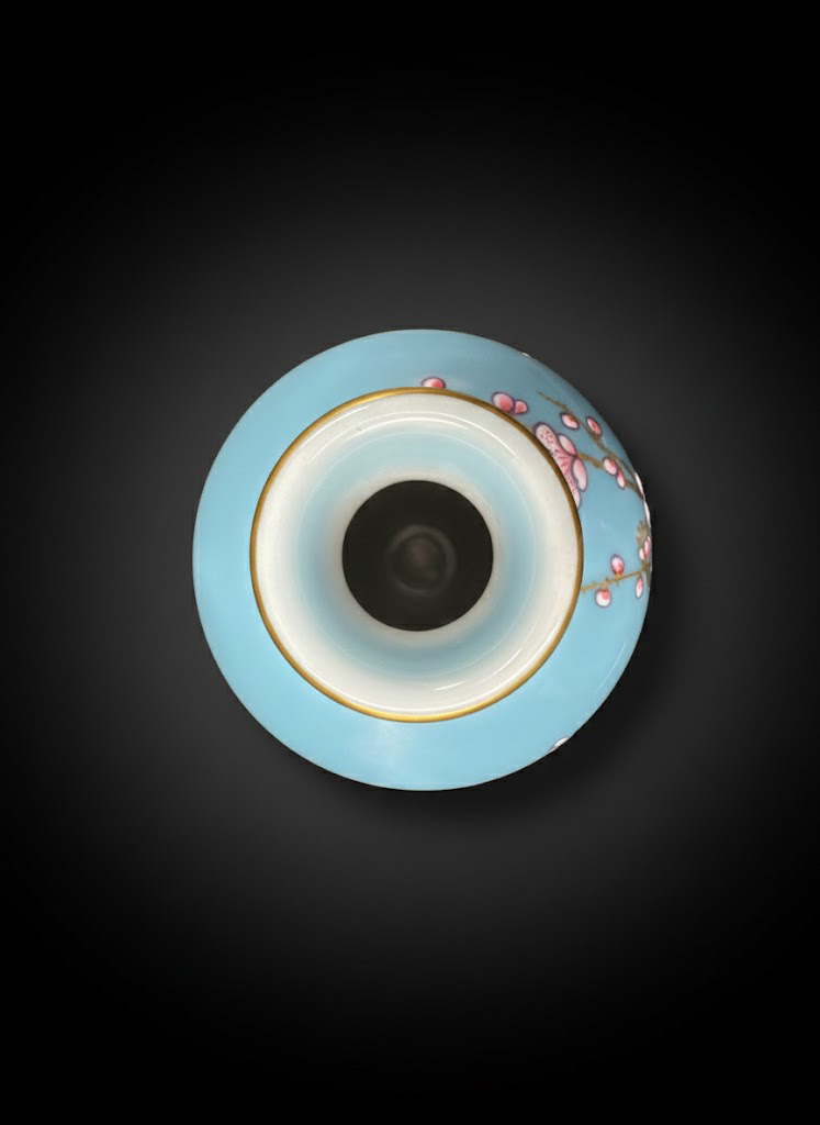 瓶身比例秀美,天青釉底纯净柔和,金线勾勒梅枝苍劲挺拔,粉彩花朵层次分明,两只雀鸟灵动生姿,一派春意盎然。