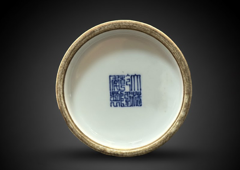 圈足规整,底心施白釉,青花篆书款“大清乾隆年制”六字清晰可辨,字体端正典雅,整体制作精致讲究。