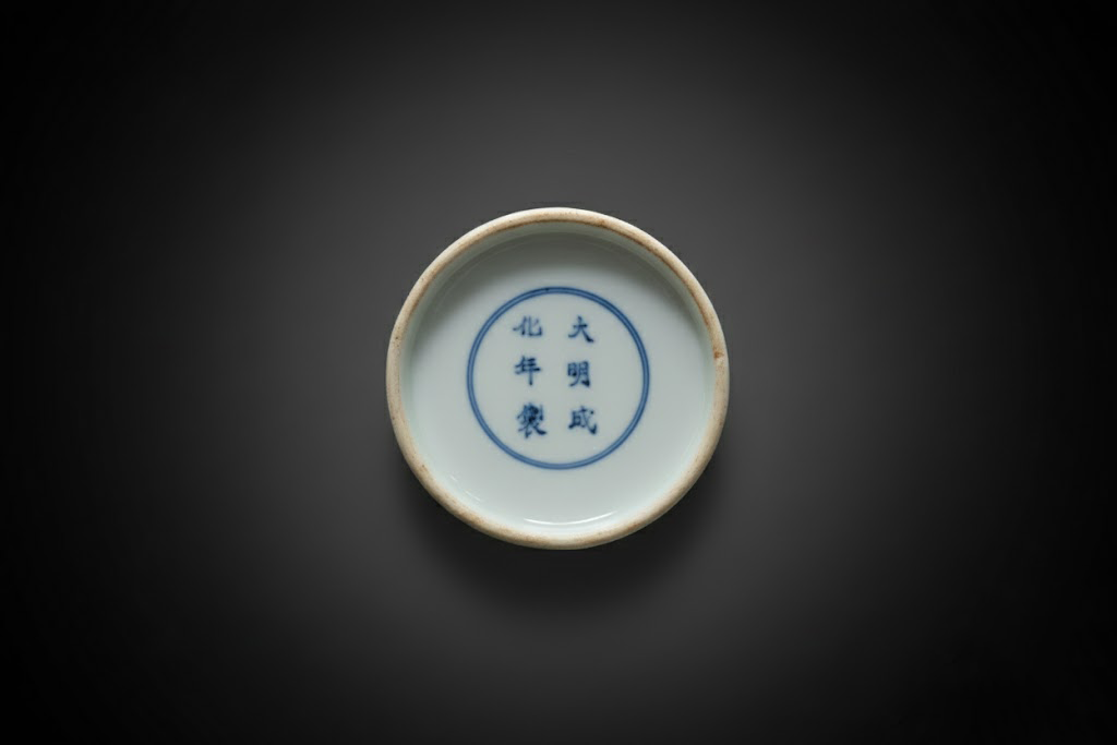 瓶底施白釉,圈足露胎,胎质细腻坚实。底心青花书写“大明成化年制”六字双行楷书款,外围双圈线装饰。此款式为清代康熙至雍正时期景德镇窑仿成化斗彩常用的标志,虽非明代御窑出品,却在胎釉、彩绘与构图上皆臻精妙,足见清代匠人追古之心与艺术造诣。