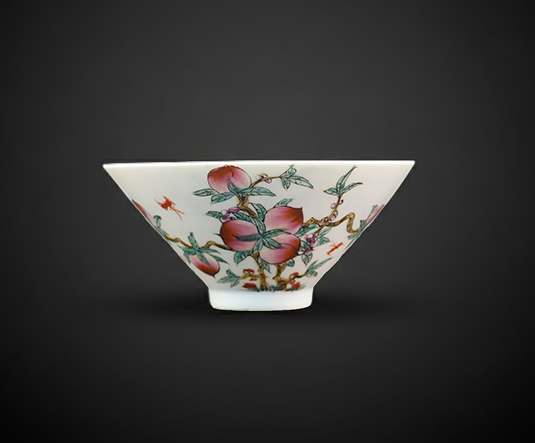 此件民国粉彩九桃斗笠碗在造型、胎釉与装饰上均追摹清雍正官窑之精气神。雍正朝粉彩以色调清雅、绘工细密著称,是清代瓷器艺术的巅峰之一。民国时期的景德镇匠人重新演绎这一经典,作品既保留古韵,又融入时代审美,成为民国仿古瓷的代表性佳作。