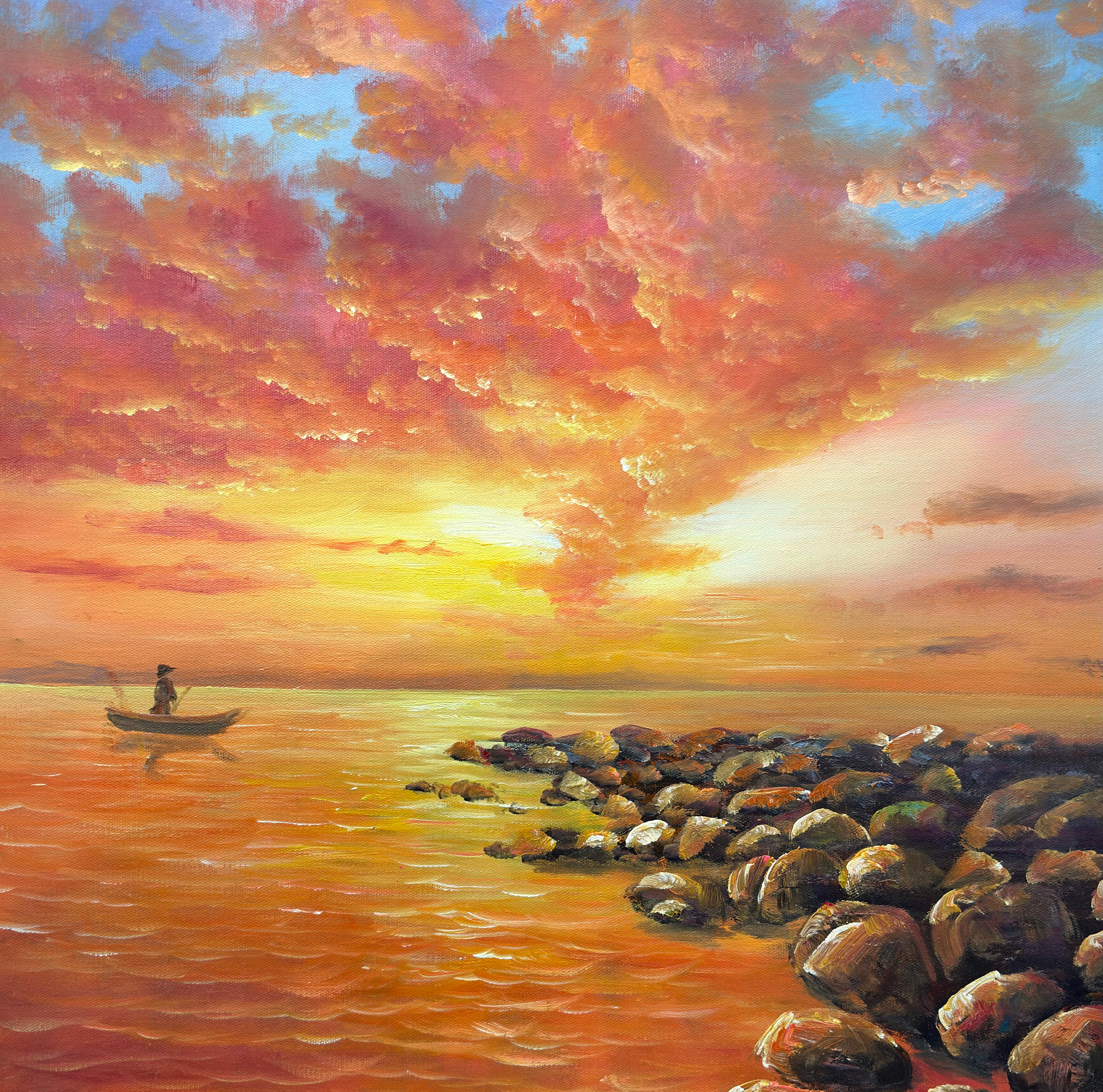 金色海面、绚丽云霞与远处小舟相互映衬,近景礁石在夕阳映照下呈现沉稳质感。