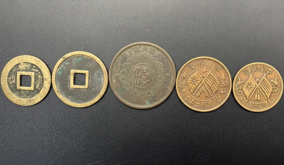 横跨清末至民国时期的铜质货币。包含清代嘉庆通宝方孔圆钱和三枚中华民国机制铜元。