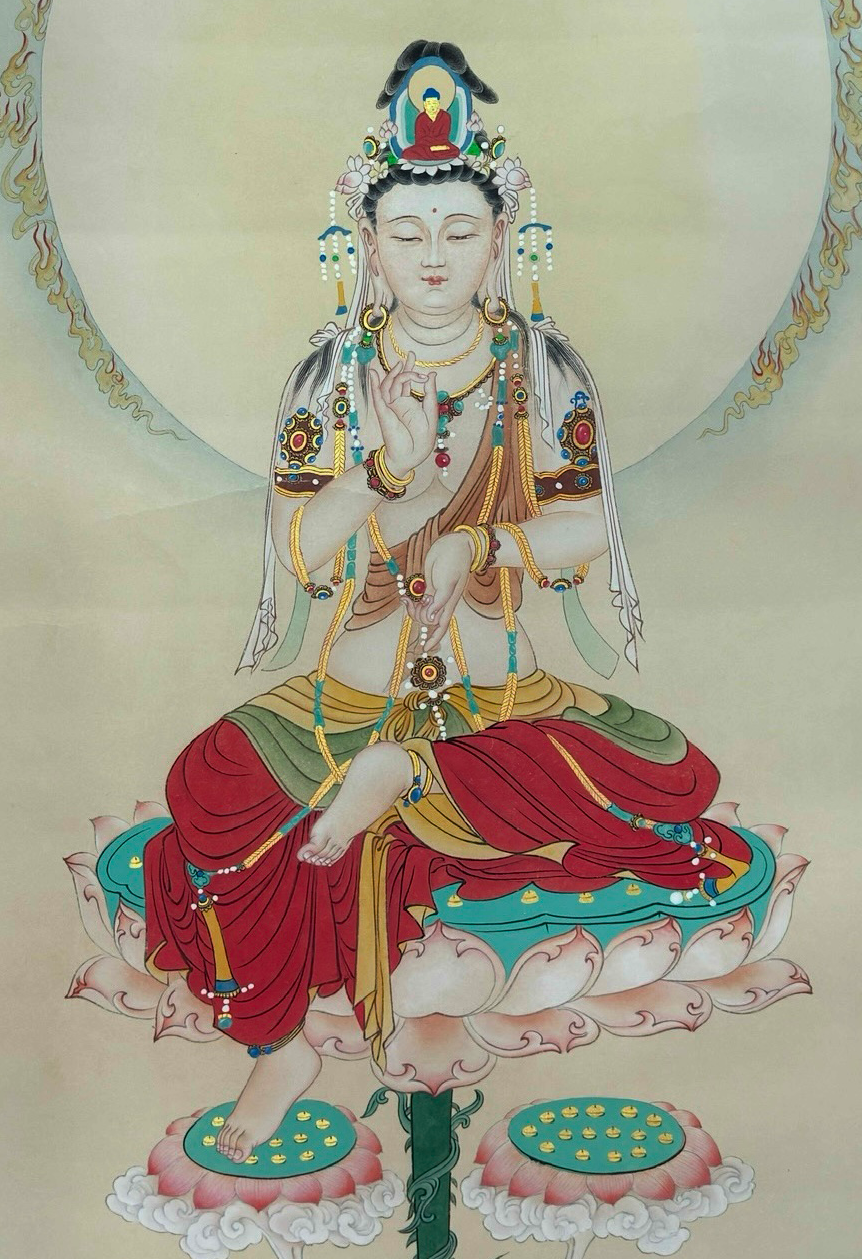作品线条细腻流畅,设色典雅明丽,观音半跏趺坐于莲台之上,法相慈悲庄严。