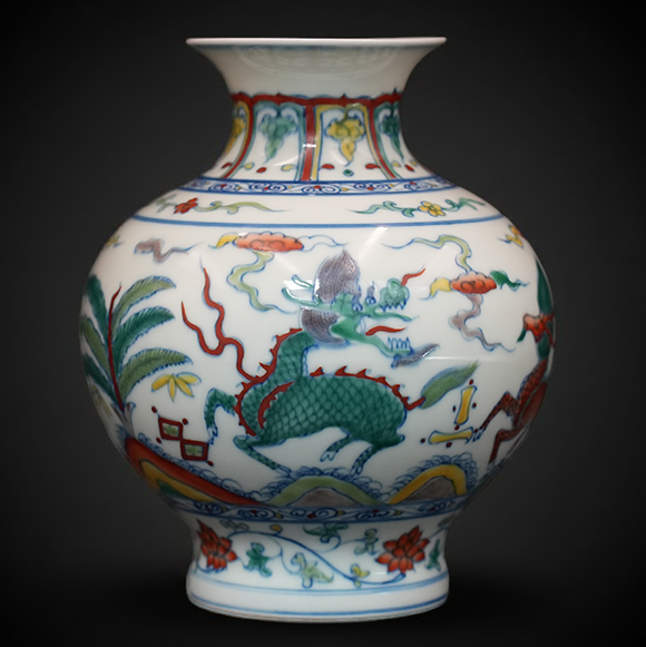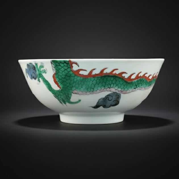 以矾红、翠绿彩绘游龙与祥云,笔法遒劲,气势非凡,尽显康熙五彩瓷的雄浑与雅致之美。