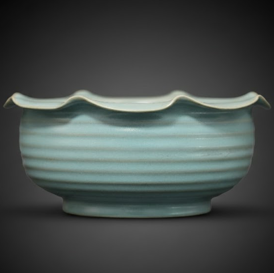 温润如玉的天青釉,莲瓣舒展的花口形,展现出“雨过天青”的雅致与静美。