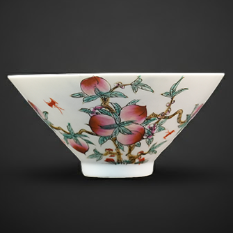 民国仿清雍正粉彩九桃斗笠碗,造型端庄,粉彩明丽,九桃与红蝠寓意“福寿双全”。