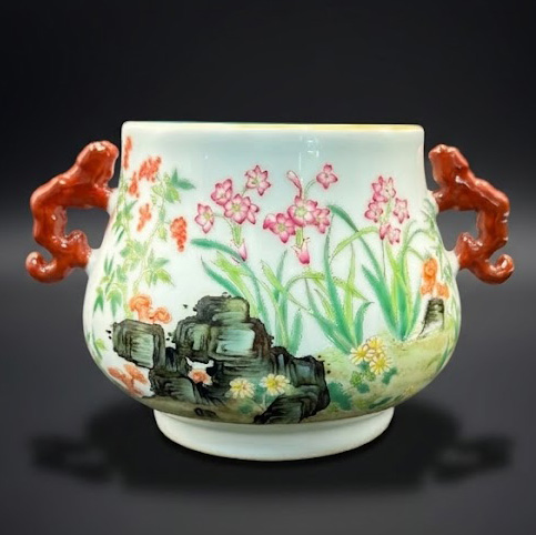 炉身以粉彩描绘灵芝、石竹等花卉,并辅以奇石点缀,构图自然舒展,色彩柔润雅致。