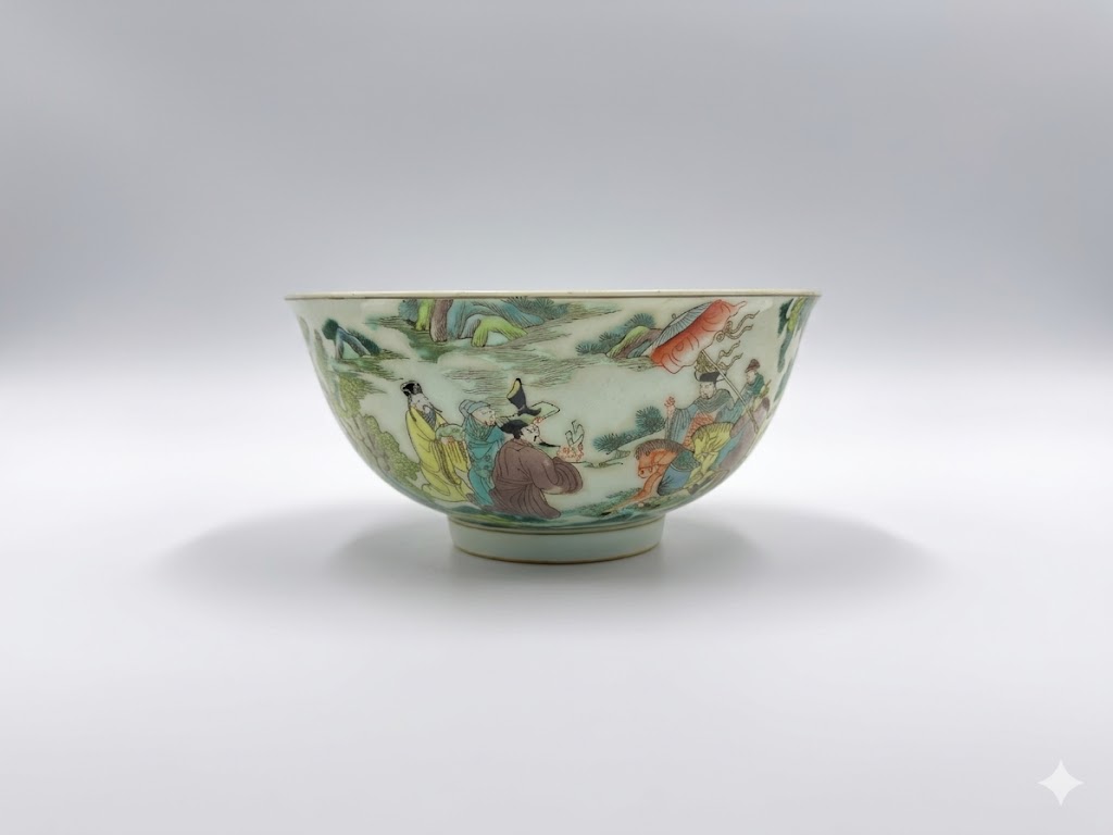清雍正粉彩人物故事纹碗,设色清雅细腻,人物生动传神。胎釉温润如玉,器形轻盈秀美。