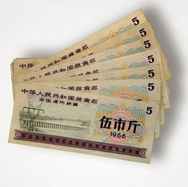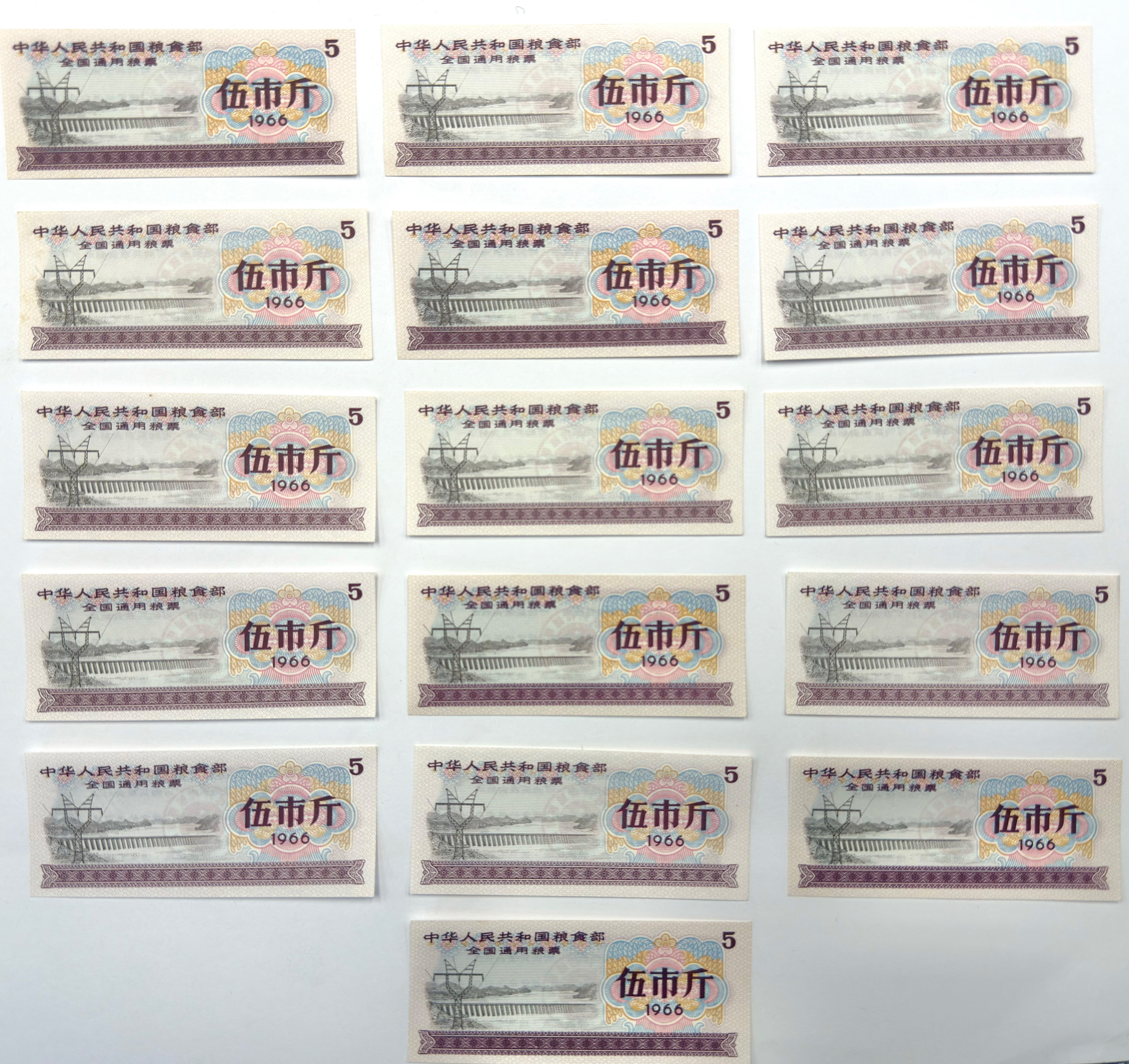 本组伍市斤粮票共16张,票面以水利工程为图案,见证了粮食配给制度与社会生活方式,