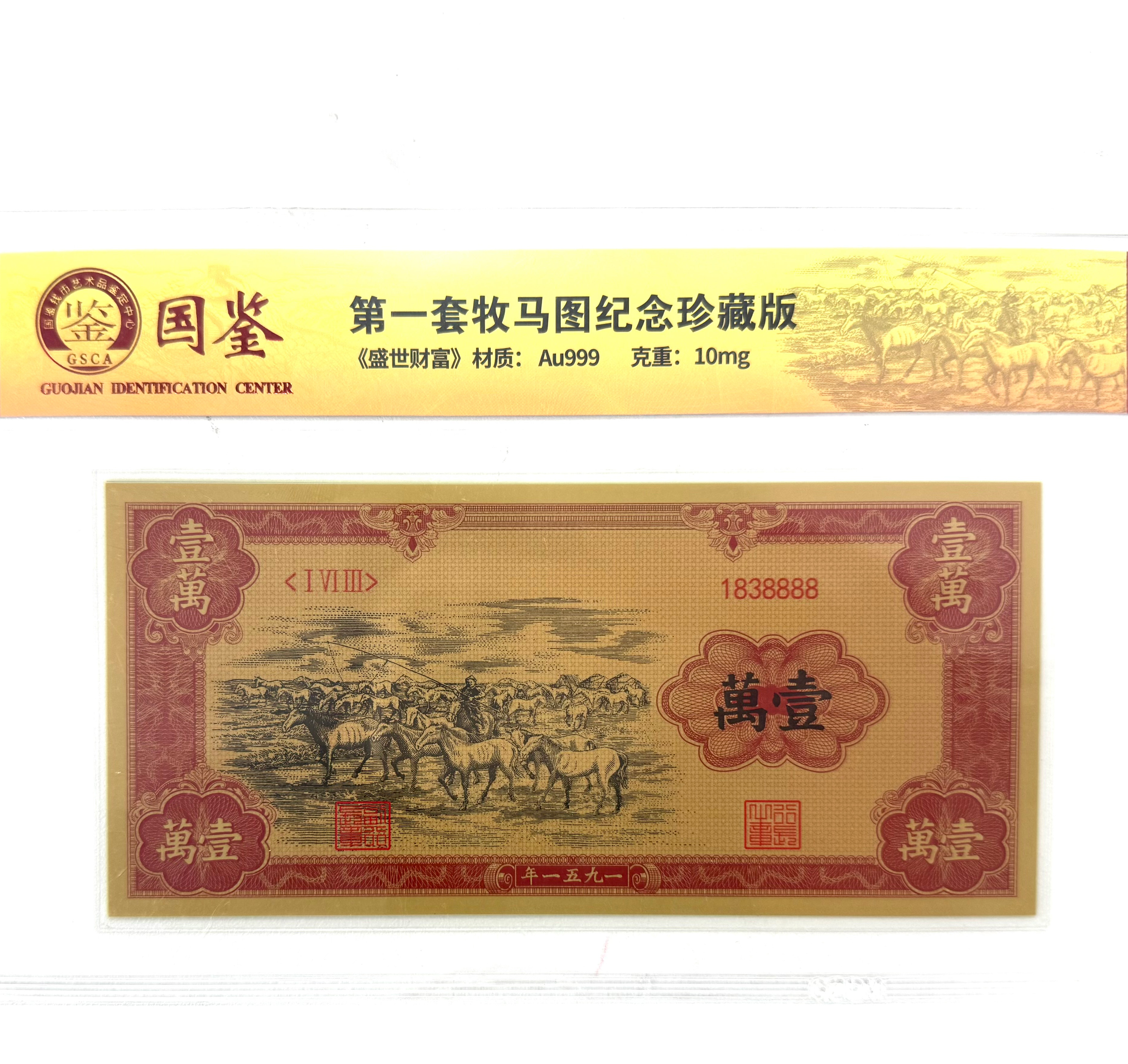 以壹万圆牧马图为原型打造,融合Au999纯金材质与微雕工艺,再现经典货币图案。