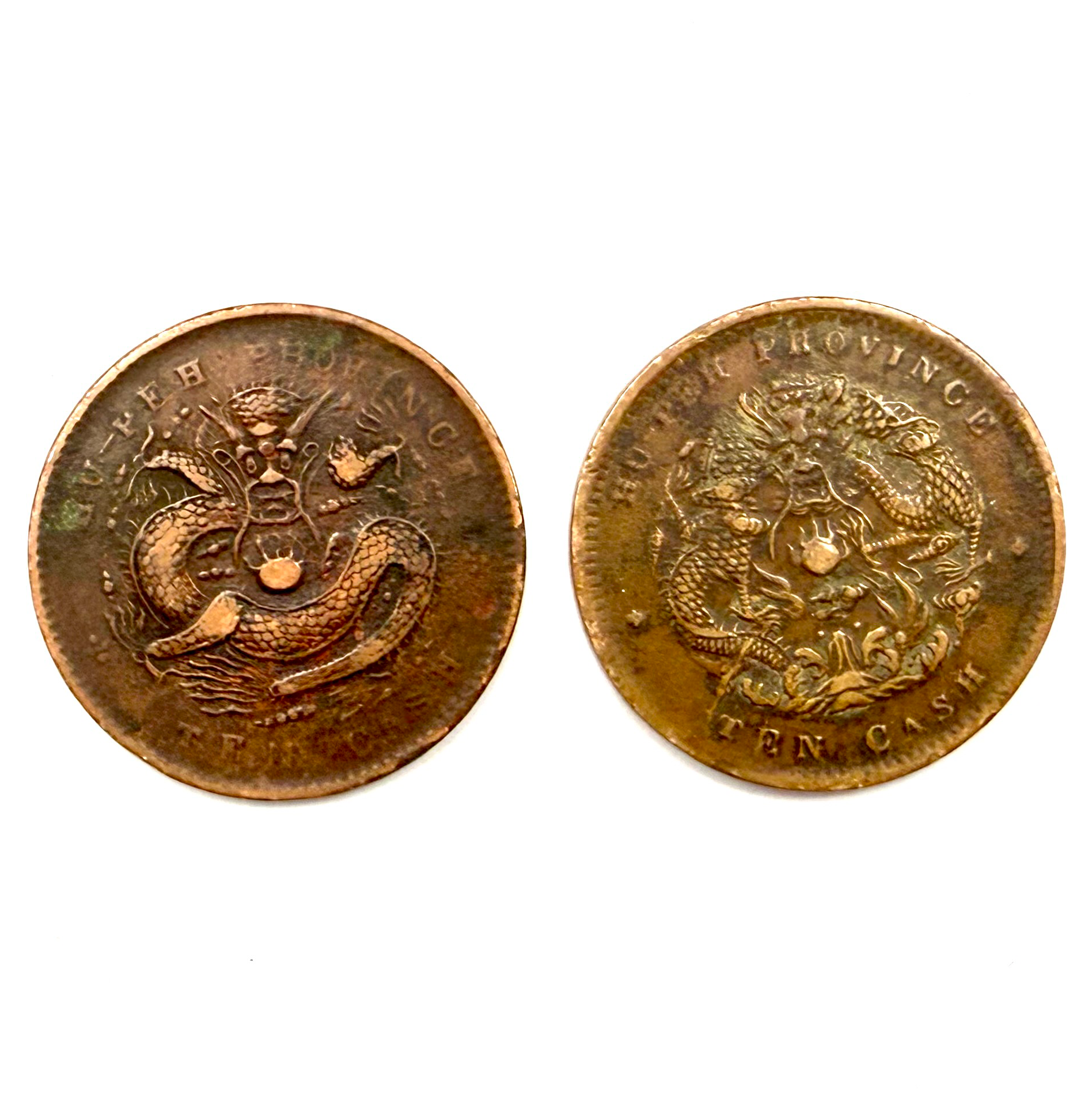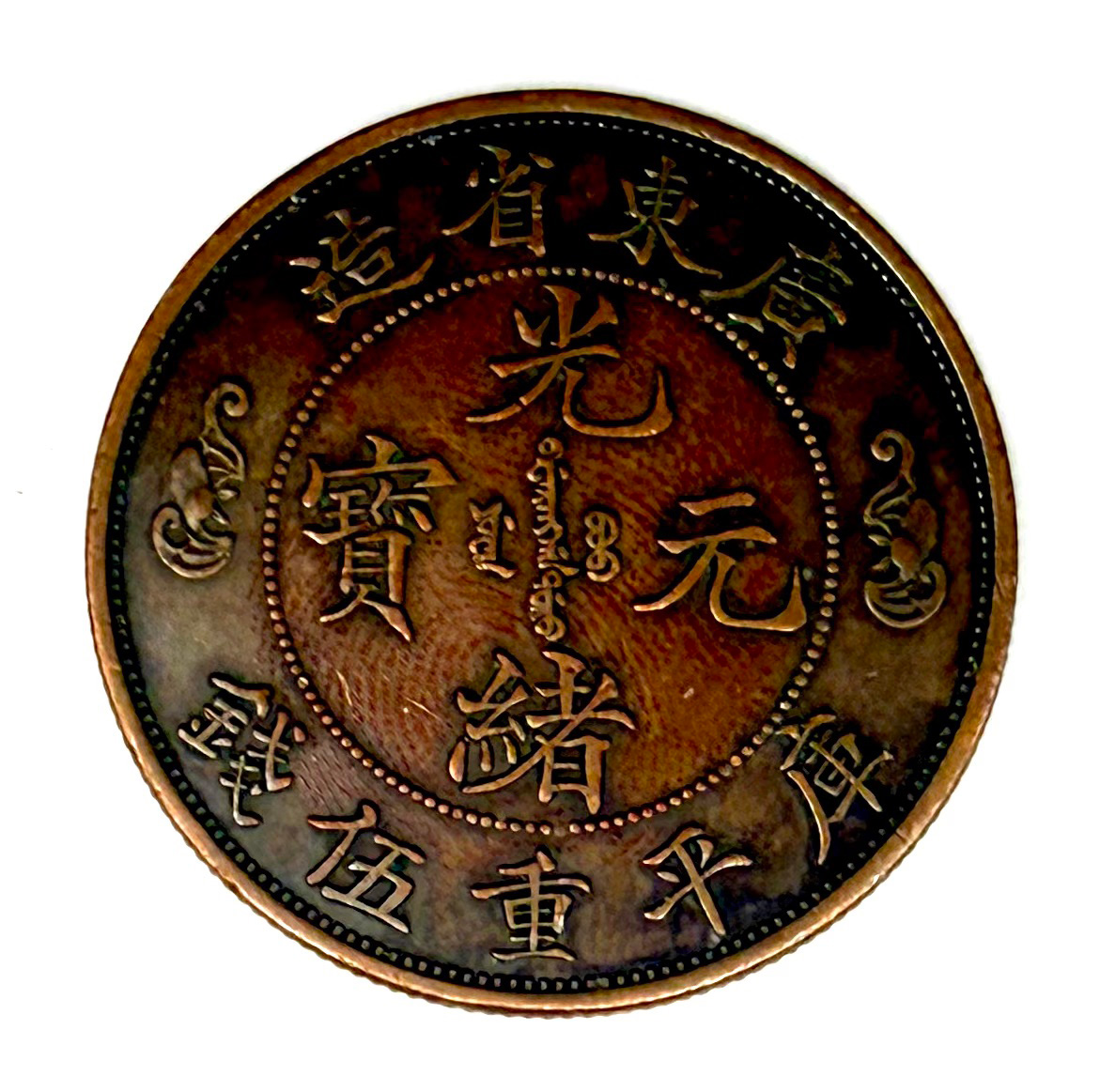 正面铸“光绪元宝”四字,内饰六瓣花纹,外环为“湖北省造”及“当十”,并辅以满文,布局规整。