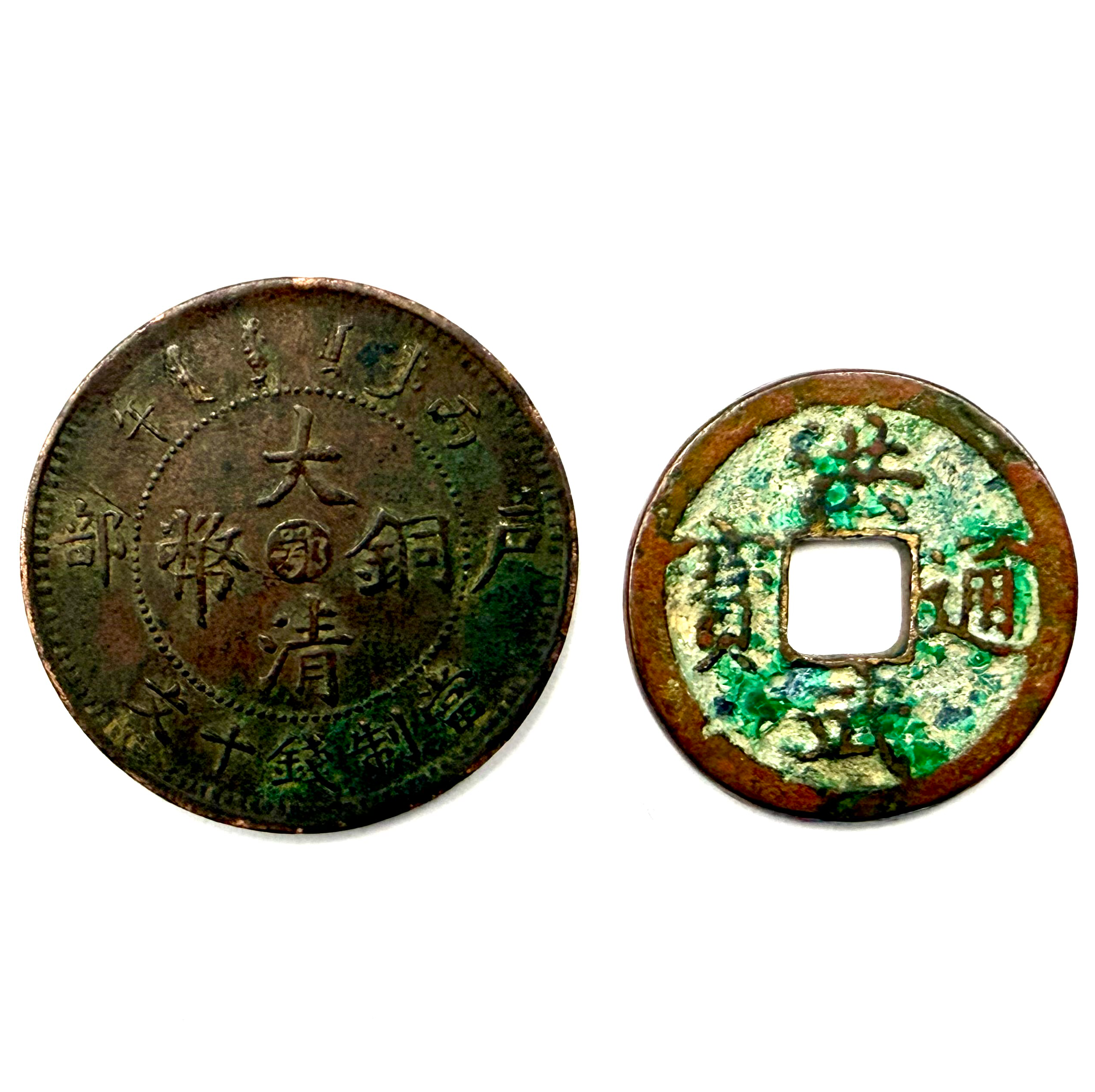 清末“大清铜币”与明代“洪武通宝”,跨越数百年时光,包浆自然古朴,尽显历史沉淀与钱币文化魅力。