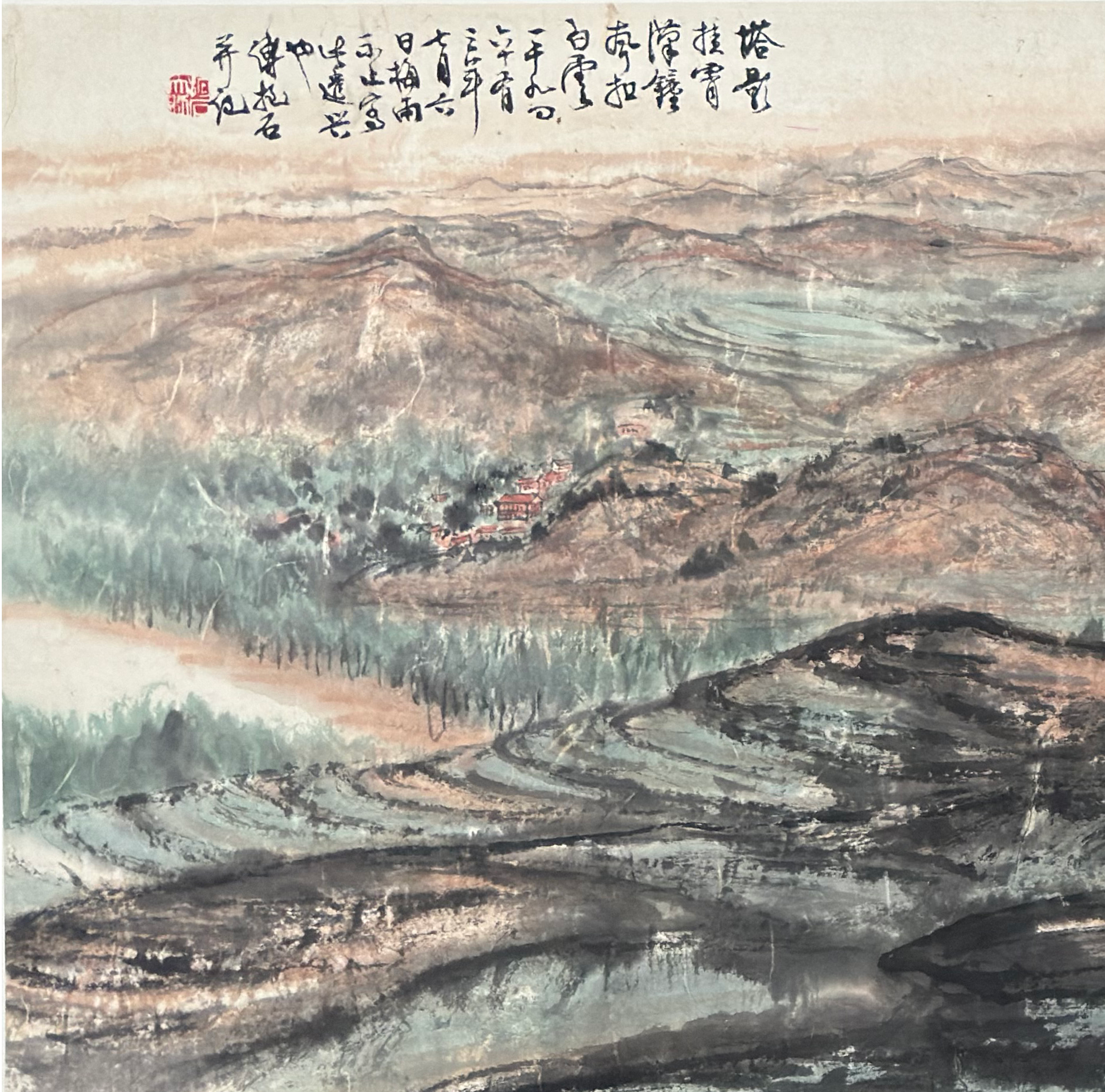 傅抱石《延安朝辉图》,描绘延安壮景,气势恢宏。题字“延安朝辉”为萧平所书,印章清晰,画书交融。
