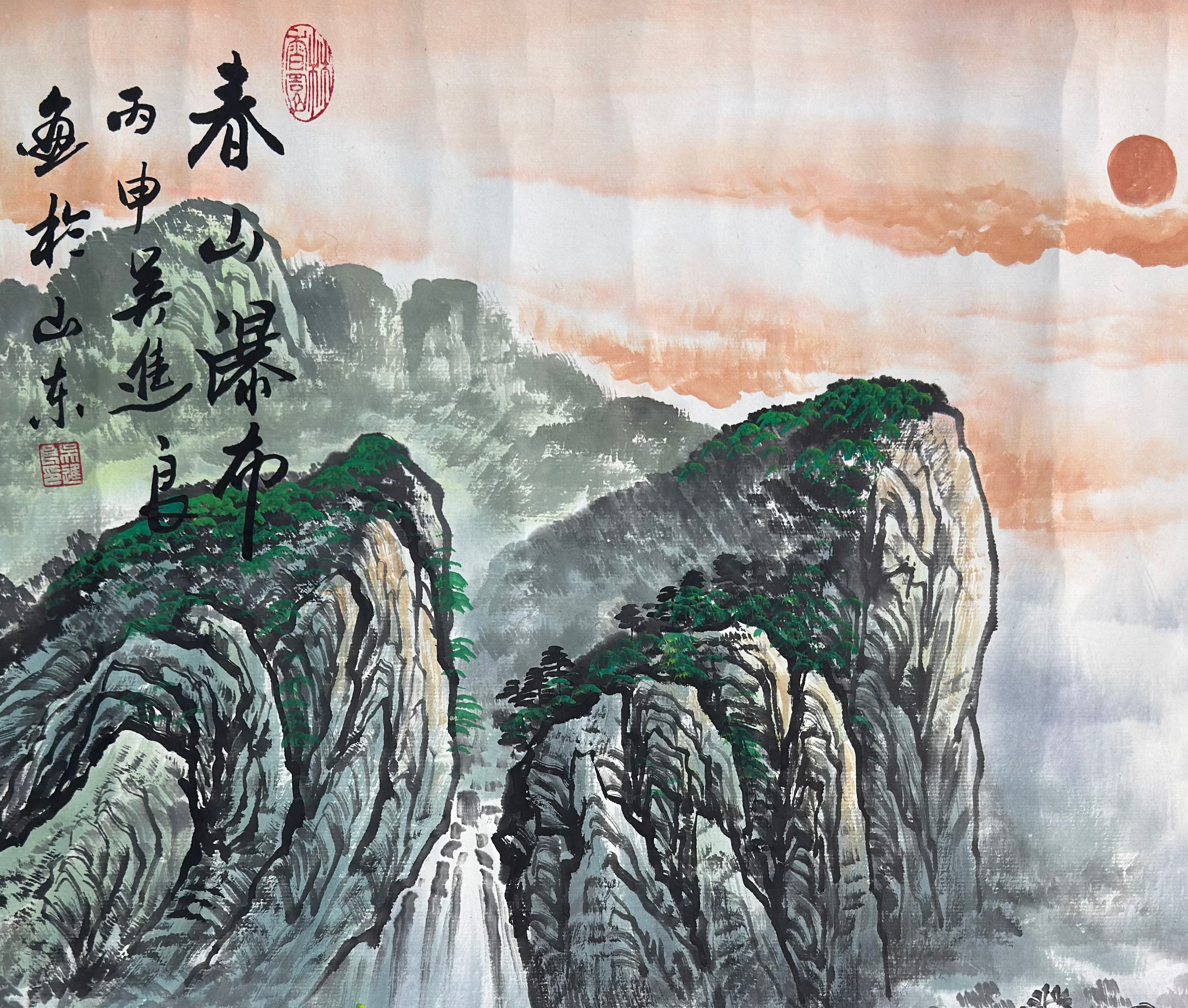 以水墨与设色技法描绘春山飞瀑,云雾缭绕,松石苍翠,展现出中国山水画的生机与诗意之美。