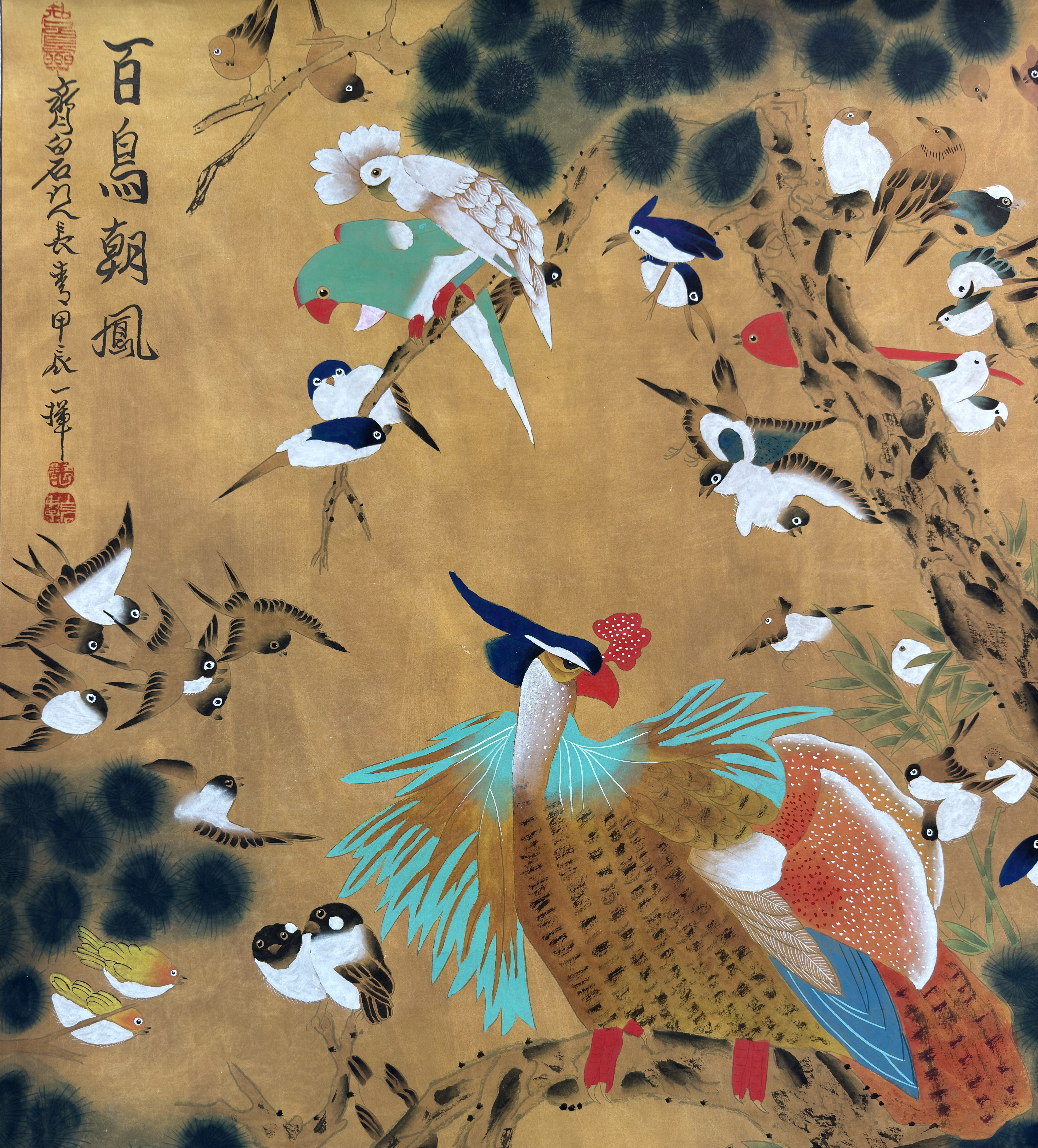 以金色为底,凤凰为尊,百鸟环绕,寓意祥瑞昌盛。构图宏大、是近代花鸟画中极具代表性的吉祥巨制。