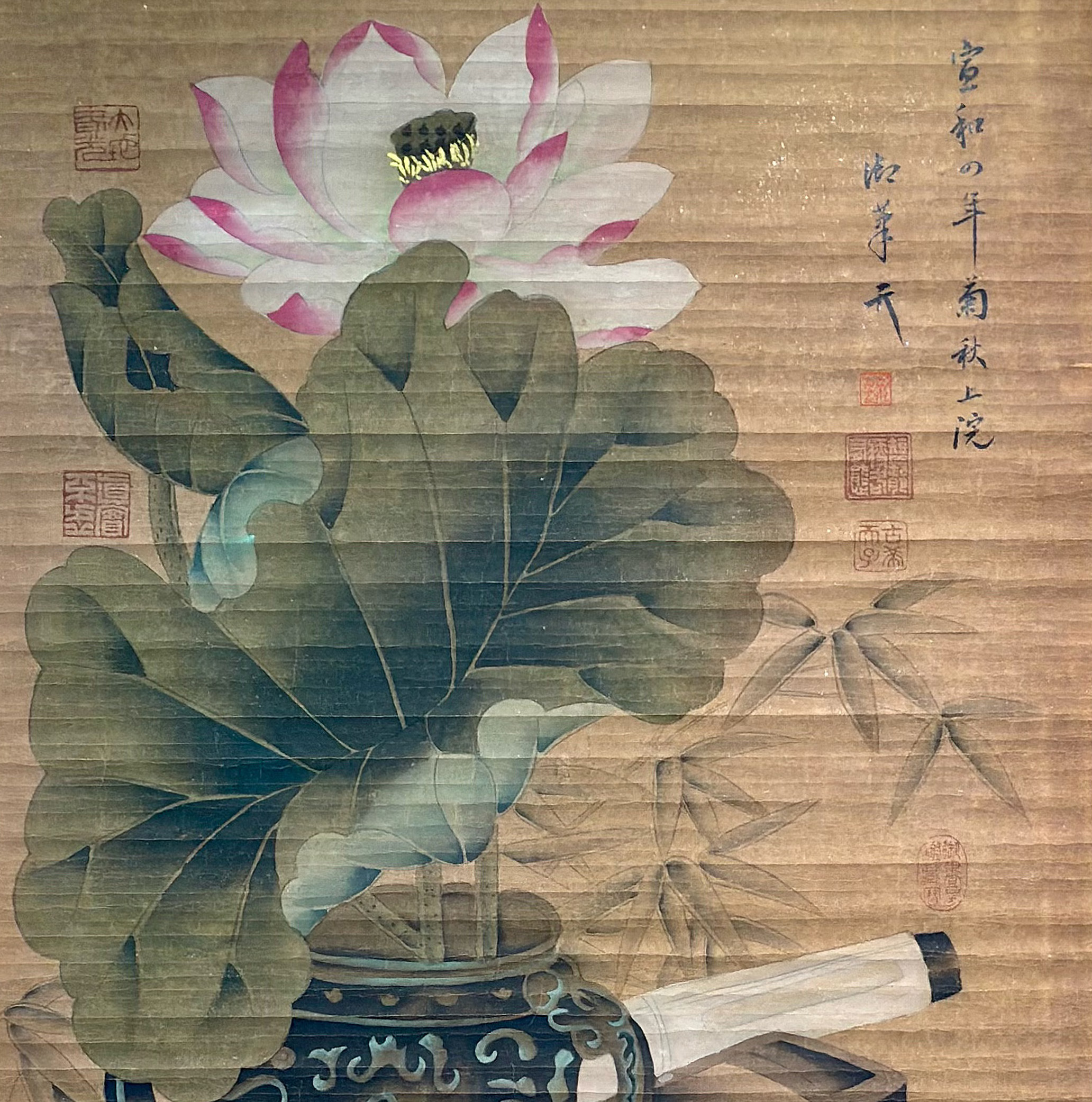 宋徽宗赵佶亲笔绘于宣和四年菊秋上院,以宫廷御制宣纸精绘荷花与清供陈设,展现北宋宫廷绘画的典雅气韵与帝王风度。