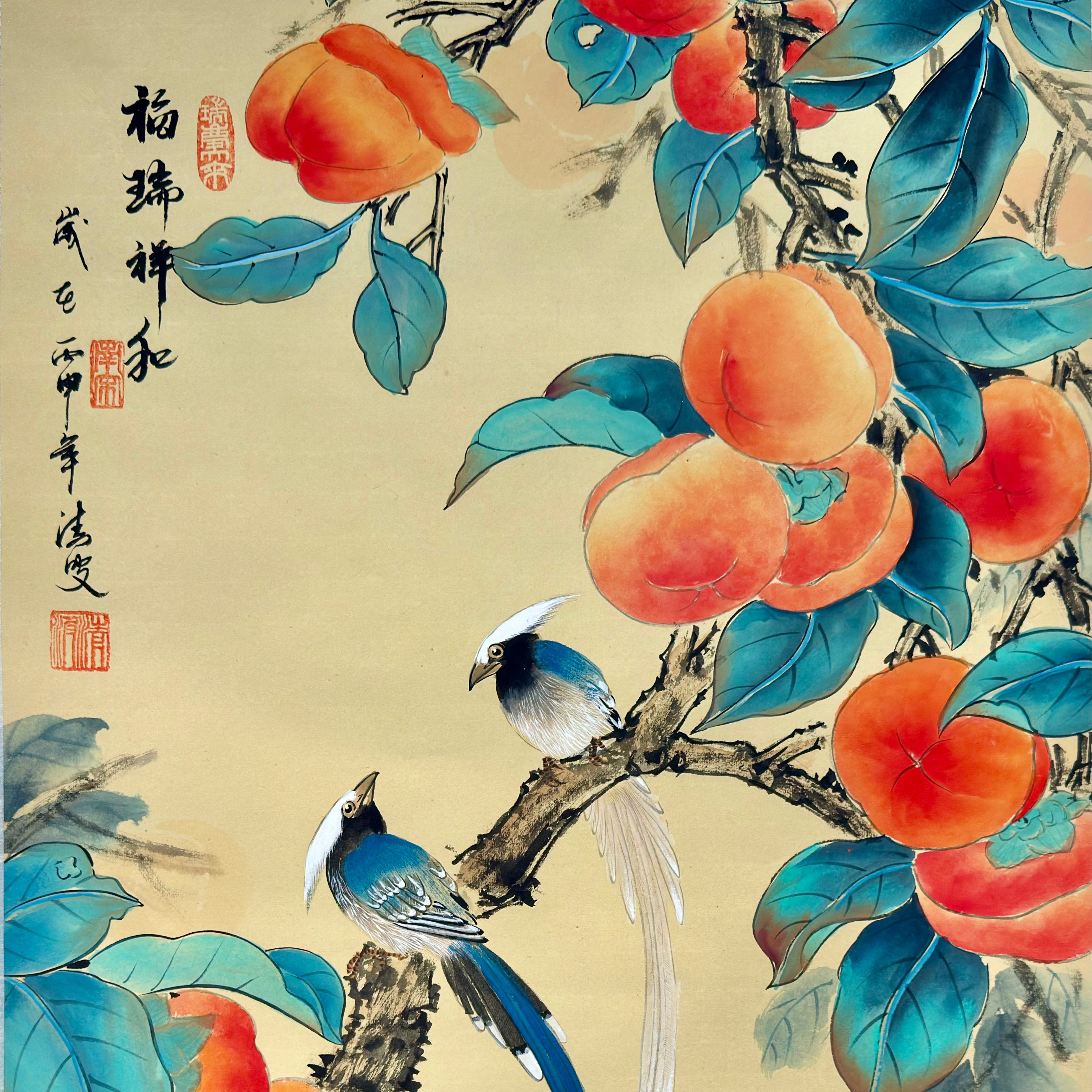 以柿枝双鸟入画,寓意事事如意、福瑞安和,色彩明丽,意境祥雅。