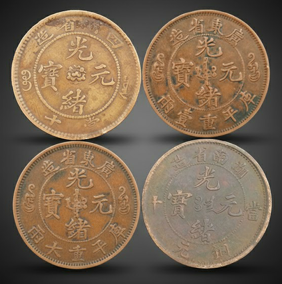 分别为广东、湖南、四川铜元,铸造精良,龙纹细腻,展现清末机制币改革的历史印记与艺术魅力。