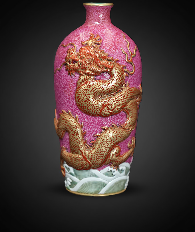 融胭脂红釉、贴塑、描金与松石绿釉等工艺于一体,金龙腾跃,釉色华美,展现清代御窑的极致工艺与皇家气度。