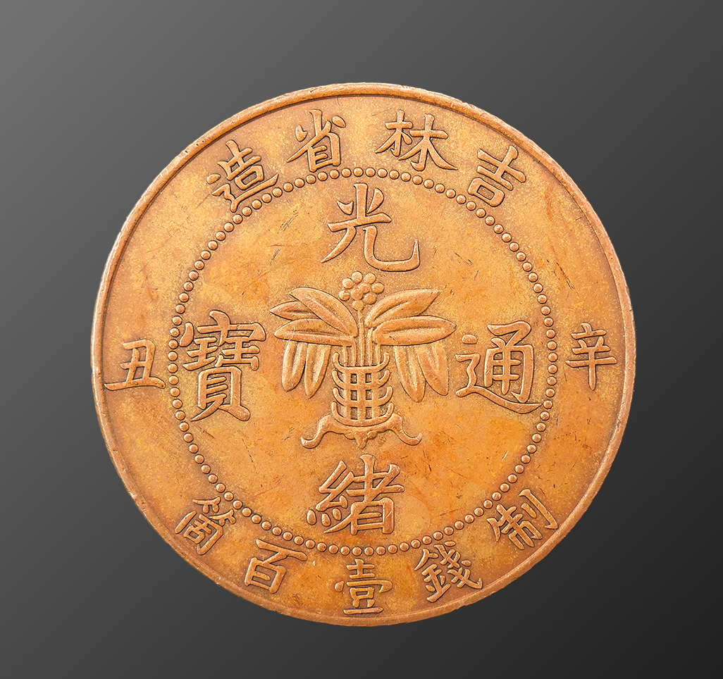 光绪二十七年(1901)铸造,大面值机制铜元,蟠龙图案雄浑有力,是近代机制币中唯一采用简字计量的典型代表。